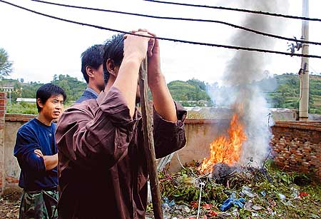 ▲9月9日,在新寺村附近一座已停产的选矿厂内,工人们正焚烧垃圾和炉内掏出的废料。