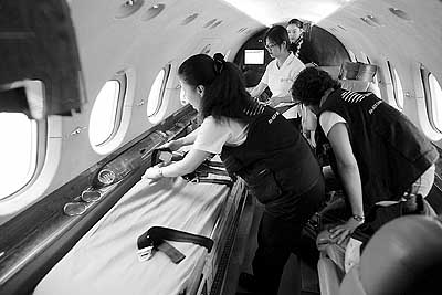 9月14日,在北京首都国际机场,医护人员在两岸急救包机上安置医疗器械。这架飞机将从北京飞往广州,然后直航台湾。当日,70多岁的病危台胞陈先生在两位亲属和两位医护人员的陪同下,于广州白云国际机场乘坐两岸航空史上第一班急救直航包机前往台北救治。