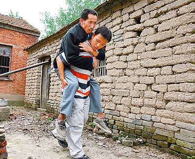 9月13日,在驻马店市皮店乡,邹尊喜背着父亲准备出发。