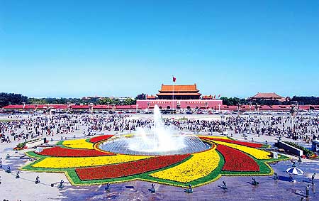 9月26日,天安门广场国庆花坛布置工程全面完成,正式向社会开放。