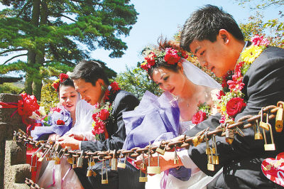 10月6日,黄山“连理松”下,两对新人正在锁连心锁。