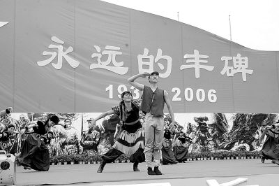 为纪念红军长征胜利70周年,日前,中国文联组织一批艺术家赴四川省泸州市古蔺县二郎镇的赤水河边,举行“永远的丰碑”纪念中国工农红军长征胜利70周年大型文艺演出。歌唱家耿莲凤、殷秀梅,曲艺家刘兰芳、张志宽,影视剧中毛泽东、朱德、周恩来的扮演者李克俭、王伍福、刘劲,以及中央民族大学舞蹈系的同学,为当地观众表演了精彩的节目。图为:“荷花奖”获得者中央民族大学舞蹈系学生表演的舞蹈《红河谷序》。