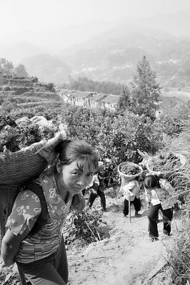 在黄金周这些天,湖北秭归县银杏沱村农民崔帮元参加“移土培肥”的背土劳动。在三峡工程蓄水至156米前,国家在三峡库区实施“移土培肥”工程,将淹没水位线下的肥土取至水位线上。秭归县从1242公顷河岸边取沃土124万立方米。