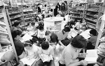 北京图书大厦少儿读物书架前,家长与孩子一起席地而坐品味读书的乐趣。十一黄金周,很多家长为了培养孩子的阅读兴趣,陪着孩子在书店中度过。