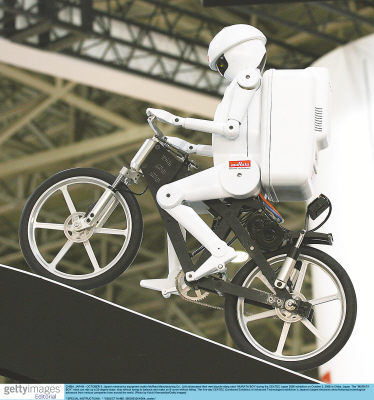 下图:上周,日本高新技术家电展上,日本电子部件专业制造商村田在展览会上推出他们的骑自行车的机器人“MURATA BOY”。这个机器人可以爬25度的斜坡,并且可以很便捷的停放,有很好的平衡性,可以走S型弯路。 梁菊供图