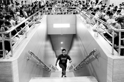 照片:7月21日,在北京某高校的考研辅导班上,来晚的学员大踏步进入“课堂”。 蔡代征摄