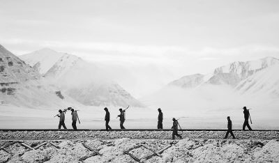 ▲唐古拉山下,一队铁路工人行走在海拔接近5000米的青藏铁路上。 倪华初摄