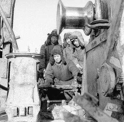▲大庆油田的王进喜师傅(前)正在给年轻钻工传授技术。 铁矛摄(资料照片)