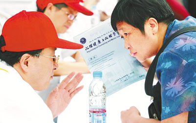 10月10日,一位市民在咨询台前咨询。当日是世界精神卫生日。在上海市南京东路步行街,该市卫生局组织的心理健康义务咨询现场“门可罗雀”。 黄炎摄(新华社发)