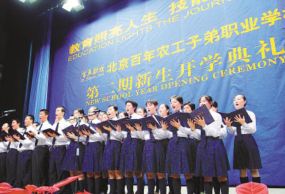 照片:10月10日,来自在京的农民工家庭和低保户家庭的学生在开学典礼上表演诗朗诵。当日,89名贫困家庭的子女走进了北京市首家全免费职业学校——北京百年农工子弟职业学校,参加这所学校第二期新生开学典礼。