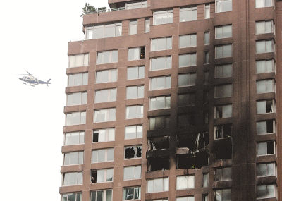 10月11日,一架美国纽约警方的直升机飞过事发地点。一架小型飞机当日下午在纽约曼哈顿岛上城坠毁,撞入东河附近的一座高层建筑并引起大火,造成至少两人死亡。美国联邦调查局已初步排除恐怖袭击的可能。