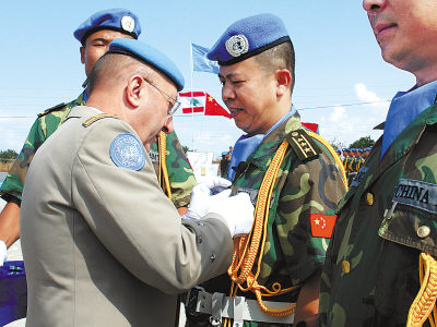 |    当地时间10月1日上午,我国驻黎巴嫩维和工兵营营区彩旗飘扬、横幅高挂,80个灯笼悬挂在营区四周,营造出浓郁的节日气息。当天,182名维和官兵被联合国授予维和勋章。    维和勋章是联合国对维和官兵的英勇、敬业和成绩的充分肯定,也是对他们为和平事业奉献的最高奖励。    维和工兵营进驻任务区的短短6个月里,经历了生与死的战火考验,目睹了和平与战争的激烈碰撞。他们用自己无畏的实际行动捍卫着橄榄枝的绿色,也捍卫了祖国的荣誉和尊严。    在黎南部,中国维和工兵的身影总是出现在最危险的地方:雷场,未爆弹区,甚至硝烟四起,轰炸不断的道路抢修现场。先后排除各种地雷和未爆炸物4000多枚,清排雷区面积5万多平方米,抢修道路50多公里。他们还无私地帮助受到战火波及的当地平民,送去人道主义救援物资,提供了医疗救助,传播联合国维和部队的和平理念,彰显了维和部队和平的使命。    当天上午,联合国驻黎巴嫩维和部队司令皮雷格里尼将军参加了授勋仪式,并亲自为维和官兵代表戴上象征和平与光荣的维和勋章。他说:“中国的军人是好样的,你们应该为自己的成绩感到自豪,为这枚象征和平和光荣的勋章而骄傲。你们当之无愧!”    “这是我们的荣誉,更是祖国的荣誉。我们要用它向祖国献礼!”罗富强营长代表全营官兵讲话时表示,“我们将继续努力,不辜负祖国和人民的期望,决不辱使命!”     |