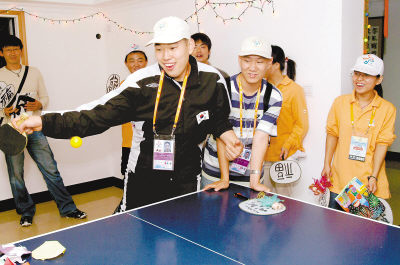 10月13日,在上海市瑞金街道活动室里,韩国特奥运动员玩起了乒乓球。
