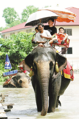 10月15日,在泰国大城府,人们借助大象通过洪水淹没的地区。进入10月,台风“象神”横扫泰国,全国76个府中有近50个受灾。据泰国通讯社报道,洪水已造成47人死亡。新华社/法新