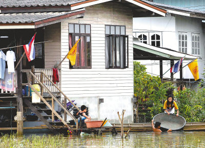 10月18日,泰国灾民在遭受洪水侵袭的巴吞他尼府传送木盆做为临时交通工具。截至当天,在泰国50多个府肆虐了半个多月的洪水已经夺去80多人的生命,另有300万人受灾,30多万人患病。新华社记者凌朔摄