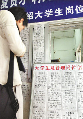 10月20日,一名求职者在大学生就业服务窗口前了解信息。近日,南京安德门民工劳务市场开辟了大学生就业服务窗口,主要向大学生提供文员、领班、技术员、工程师等需要一定文化和技术含量的岗位,吸引了不少大学生来此求职。新华社记者 孙参摄