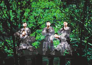|        10月16日,由著名作曲家谭盾担任作曲和总导演的,在河南登封市待仙沟内的嵩山峡谷中举行首场试演。演出分为《水乐·禅境》、《木乐·禅定》、《风乐·禅武》、《光乐·禅悟》和《石乐·禅颂》五场,木鱼、风铃、风拳、风棍、风旗和石头都成为了谭盾的音乐元素,配合绚丽灯光,场景如梦如幻。艺术家们将根据试演后的反馈对《禅宗少林·音乐大典》进行修改,2007年3月正式公演。图为:梅花桩上的武僧身披“雪花”。    本报记者 刘占坤摄     |