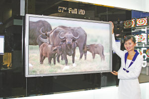 |        10月18日,在中国三大IT展会之一的2006中国苏州电子信息博览会(eMEX2006)上,韩国三星电子展示了57英寸全高清(Full-HD)液晶(LCD)面板。其清晰度达到1920×1080,是普通高清HD(1366×768)的两倍,是标清SD(720×480)的6倍。    三星还展出了超高清晰度(2560×1600)显示的30英寸台式显示器。这种产品适合图表设计、游戏和医疗系统等专业应用。据三星电子LCD事业部营销总裁承汉透露,三星将把超大型、超高清晰度30英寸显示器产品作为产能调整的重点方向。    本报记者 滕兴才文并摄     |
