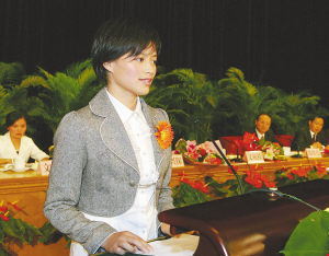 照片:10月27日,由中宣部、国家旅游局、湖南省委共同举办的全国模范导游员文花枝先进事迹报告会在北京人民大会堂举行。这是文花枝同志在作报告。