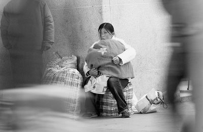 照片:1月3日,一名安徽籍在南京打工的打工妹,抱着孩子、守着行李,在南京火车站等候返乡的列车。郎从柳摄