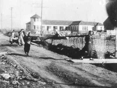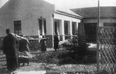 去年10月初,丹麦人玛丽安赠给本报记者一批历史照片的拷贝,其中有一张就是以这幢锥顶小楼为背景的。画面是农民抬着伤员,正进入这幢小楼所在的单位。图片说明是:“乡下的老百姓抬着伤员去一家靠传教士们供给的急诊医院。摄于1938年2月17日。请注意,人们运送伤员的工具非常简陋,伤员大多数是在日军占领后受害的平民。”(见图二)