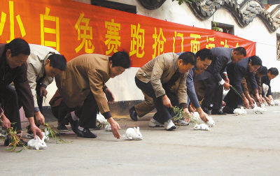 10月29日,南京一家茶叶市场开业在即,各商户争抢地段好的门面,业主一致赞同用小白兔赛跑的名次来选定门面。徐永现摄