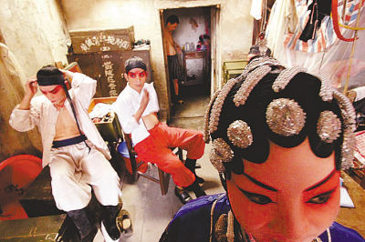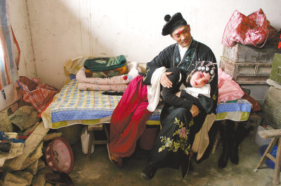 戏班的生活挺苦的。常年的演出都在农村,全团二十多个人经常挤在三四间房里。夫妻不能住在一起,而是按性别分着住。不过,成双成对的在团里总是受到照应。做丈夫的最高兴的是衣服有人洗,做妻子的最高兴的是转场时有人干重活。