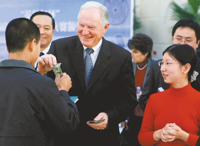 10月31日,一名清华大学学生让英特尔公司董事会主席贝瑞特为自己即将创办的公司投资1美元,并承诺10年后将把公司办成世界级的公司,贝瑞特博士迅速并愉快地掏出了1美元。当日,在北京访问的贝瑞特来到清华科技园,为参加“英特尔杯”第九届清华创业计划大赛的获奖学生颁奖。本报记者 刘占坤摄