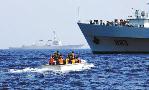 2006年11月19日,中美海军在南海海域成功举行海上联合搜救演习。图为中美海军援救分队快速向“遇险”船只抵近。