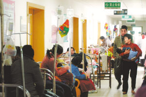 11月23日,在安徽省亳州市人民医院儿科住院部,由于小患者明显增多,医院不得不在病房外的走道上增加临时病床和临时输液点。当日,在阴雨的“逼迫”下,亳州市的气温变化较大,最低气温降到了4℃以下,导致患呼吸道感染的儿童不断增多。医生提醒家长,如果孩子身体不适,有类似感冒的症状,应立即就医,以免延误病情,引发并发症。