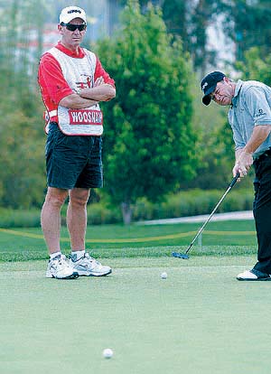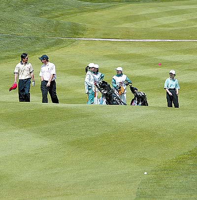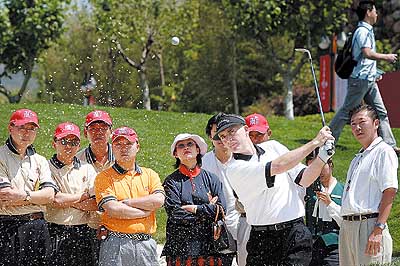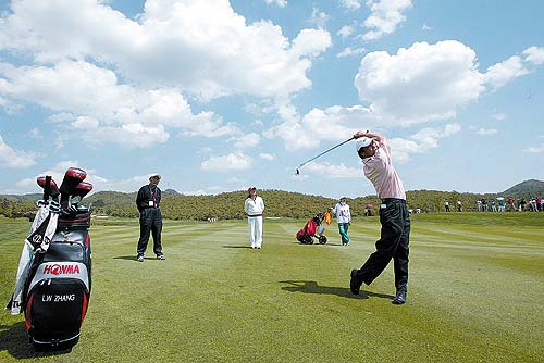 ▲在昆明阳光高尔夫球会举行的 2004“玉溪杯”高尔夫邀请赛上,中国第一球手张连伟挥杆竞技。