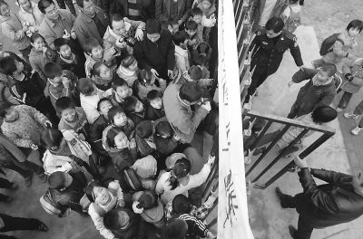 11月27日,在西安市灞桥区十里铺李家堡小学门前,小学建设者因多次讨要工钱未果,用锁锁住校门,致使在此就读的300名学生伫立在寒风中无法上课。经过民警干预,工程承包人终于开门让孩子们进校门上课。袁景智摄