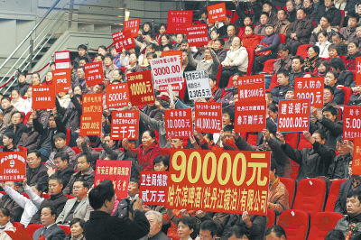 11月27日,在黑龙江省牡丹江市捐资助学总结表彰大会暨第36次捐助活动现场,社会各界人士纷纷打出爱心牌。据了解,当地开展爱心助学活动10年来,社会各界群众为贫困学生捐款1300余万元,有5万余名贫困学生获得资助。陈占辉摄(新华社发)
