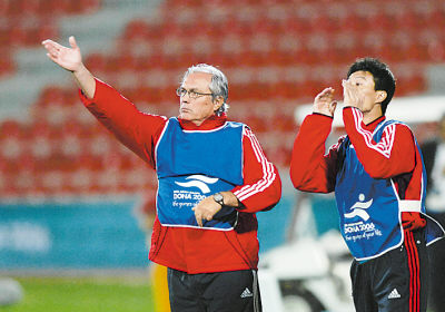 11月30日,中国队主帅杜伊科维奇(左)和助理教练区楚良在场边指挥。当日,在多哈亚运会足球小组赛E组比赛中,中国队以1∶0战胜伊拉克队。新华社记者李尕摄