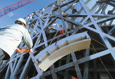 11月30日,国家体育场(鸟巢)主体结构工程的最后一个钢结构吊起安装。当日,2008年奥运会主会场——国家体育场最关键的项目——钢结构吊装施工全部完成,这标志着国家体育场主体结构工程施工全部结束,施工重点将转向膜结构、装饰装修、机电设备安装和室外工程施工。新华社记者李文摄