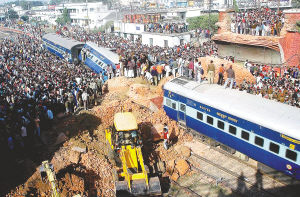 12月2日,在印度比哈尔邦帕格尔布尔,人们聚集在天桥坍塌现场。当天上午,帕格尔布尔火车站附近一座有150年历史的老天桥突然坍塌,砸在一列缓慢进站的火车上,目前事故死亡人数已升至32人。