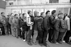 12月4日,重庆在京务工人员在北京飞鹰宾馆外排队等候办理第二代身份证。11月底,重庆市公安局专门派遣一个小分队进京,为重庆在京务工人员办理第二代身份证。