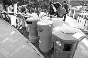 这是利用牛奶盒、塑料盒等废弃物挤压后做成的可再生环保材料的果皮箱,还可以回收再利用,并且价格便宜,抗压耐热能力也一点都不逊色于传统的不锈钢果皮箱。(张斌)