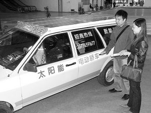 国内首辆太阳能轿车日前在南京国际展览中心亮相,它可以由太阳能驱动,行驶速度最高可达每小时88公里。这种太阳能汽车预计在两年内上市,价格在25万元人民币左右。(虚怀广)
