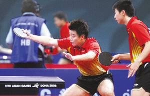 12月6日,王皓/马龙在亚运会男双半决赛中,以2∶4负于中国香港队的高礼泽/李静。小艾摄