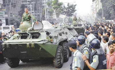 12月10日,在孟加拉国首都达卡,士兵驾驶装甲车驶向总统府。孟加拉国总统、看守内阁总理亚杰丁·艾哈迈德9日要求军队维护国家的安全与秩序,平息大选前动荡的政治局势。新华社/法新