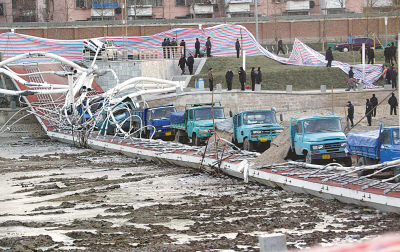12月9日14时,北京市顺义区卧龙环岛北侧碱河上,一座正在进行载重量测试悬索桥被10辆货车压垮,事故中3人受伤,其中1人重伤。甄宏戈摄