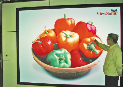 1年前,我国展出最新研制成功的140英寸大屏幕背投显示样机。图为我国激光显示技术的学术带头人许祖彦院士在样机前。董志翔摄