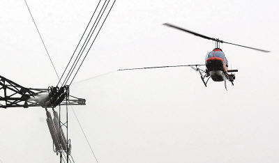 在三峡电站送出500千伏江城直流高压线湖南段的宁乡横市杆塔之间,一架红色直升机徐徐靠近一个铁塔,在空中稳稳停住,一股水流从高压水枪喷出,10多分钟后,积满污垢的黑色高压线瓷瓶绝缘子露出了原来的白色。