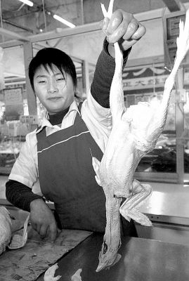 12月12日,在长春市建设街菜市场做生意的小王在展示她库存的一只“白条鸡”。她的摊位已经断货3天。近日,长春市屠宰企业将每只鸡的宰杀、去毛及检疫的价格从原来的0.4元提高到0.8元,而收鸡商认为如果屠宰费再涨,他们将无利润可赚,加上运输费用有的客商甚至赔钱,所以部分收鸡商停止供应“白条鸡”,造成长春市内各农贸市场“白条鸡”供应紧张,市场库存“白条鸡”也由原来的每公斤9元左右,上涨到每公斤10元左右。新华社记者蒋林摄