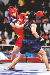 12月14日,来自浙江的中国选手徐延飞(左)在多哈亚运会武术男子散打70公斤级决赛中,战胜菲律宾选手,获得冠军。新华社记者李紫恒摄