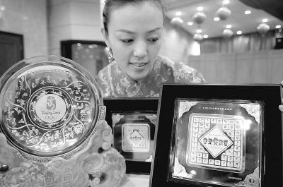 12月15日,北京,工作人员展示“北京2008年奥运会纪念金盘、纪念金银砖”。当天,百年奥运史上的第一枚金盘和第一套奥运金银砖在北京举行首发仪式。