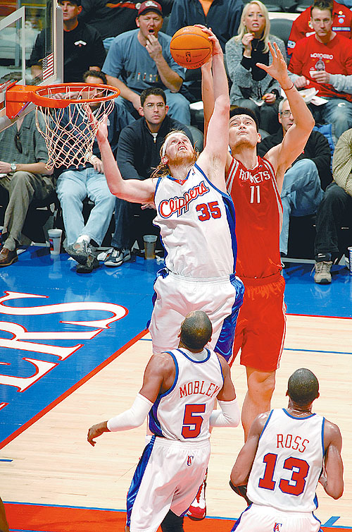 12月18日,在NBA常规赛中,火箭队客场以108∶103击败快船队。图为姚明在盖帽。 诺阿摄