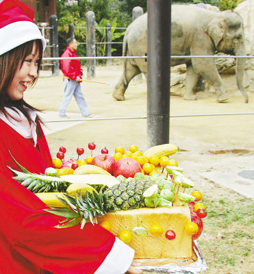 12月24日,在日本东京的一个动物园,打扮成圣诞老人模样的工作人员为大象准备了圣诞礼物——水果蛋糕。新华社/法新
