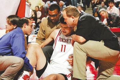 |        12月24日,姚明在对快船的第一节比赛中受伤离场,目前被初步诊断为右小腿胫骨骨裂。姚明下场之后,火箭队在主场以93∶98负于对手。    “姚明的胫骨上有一条很明显的骨裂线,我认为他需要静养大概6周。另有一种选择就是做手术,但我们希望不到万不得已尽量不要做手术。”火箭训练师琼斯说。    现在,火箭队两大巨星都被放在伤病名单上,《福克斯体育网》发表评论说:当姚明迎来职业生涯的新高峰时,伤病再次成为拦路虎,加上仍在养伤的麦蒂,火箭的坏日子“终于”到来了。    本赛季是姚明参加的NBA第五个赛季,前三个赛季他只错过了两场比赛,从上赛季至今,这已经是姚明的第三次受伤。    在上赛季的常规赛中,姚明的大脚趾发炎,不得不缺席了21场比赛,复出后没多久,他就在对爵士的比赛中被踢伤,彻底告别了上赛季常规赛的最后4场比赛。12月24日,姚明再次受到职业生涯以来最重的伤病。    目前,姚明正处在职业生涯的黄金时期。这次受伤来得太不是时候。    本赛季,他的表现超过以往,平均每场拿下27分和9个篮板,已经成为最有价值球员的热门候选人。“对球队和姚明来说,这都是一个很大的伤害。”阿尔斯通说,“我们现在谈论的是一名能够竞逐最有价值球员奖项的巨星,这个人在过去的两个赛季中一直能够带领球队前进,但现在又受伤了,真令人痛心。”    “当我看见姚明一下子倒在地板上时,我感到很震惊。”后卫海德说,“以前,姚明经常会摔倒在地板上,但从来没有像今天这样,躺在那里这么长的时间。在那个时刻,你会看见许多球迷都低下了头,大家不忍心看到这个情景,所有的人都很担心。”    火箭主帅范甘迪也非常懊恼,赛前他还大谈麦蒂何时回归,没想到姚明却“倒下了”,“过去两个赛季,如果有一个运动员不应该承受如此大的打击,那就非姚明莫属了。他总是非常努力,他的身体状态一直保持得很好,我对他的受伤表示遗憾。”    姚明的离场对球队的打击不言而喻。尽管本场比赛火箭有3人的得分上了20,但仍难逃落败的命运。    郁闷不已的范甘迪把怨气都撒到火箭队员的身上。“其实我们完全能够赢下比赛,但却没有做到。姚明受伤让我心情不好,而球队在下半场的表现也让我很是失望。”    范帅没有直接指出是谁丧失了斗志,海德承认的确有一些球员在姚明受伤离场后丧失了斗志:“我看见,当姚明离场的时候,的确有一些队友低下了头。上半场结束时我们还有9分的领先优势,但到了下半场就投不进球了。”    “姚明离场后,我们开始慢慢地控制了主动权。”快船主教练麦克·邓利维说,“我们的转移球变得更流畅,每一个人都有空位投篮的机会,也能把球投中。”    火箭队如何面对失去了“双核心”的现状?巴蒂尔说,全队上下必须坚强起来。    “我们别无选择,”巴蒂尔说。他本场比赛得到了赛季个人新高28分。“我们必须表现得更顽强,我们必须保持高昂的斗志,当姚麦不在时,我们不能先自己击垮了自己。”    不过,很多NBA专家并不看好火箭队的前景,《休斯敦纪事报》专栏作家费根发表评论说:火箭原来的目标是打进季后赛,可是现在看来,这个目标越来越难以实现。现在,火箭队能做的只有坚持,坚持6周(或更久),在这6周里,火箭队也许能碰巧赢一两场球。    照片:12月24日,NBA常规赛,姚明在比赛中受伤,随后痛苦离场。盖蒂摄     |